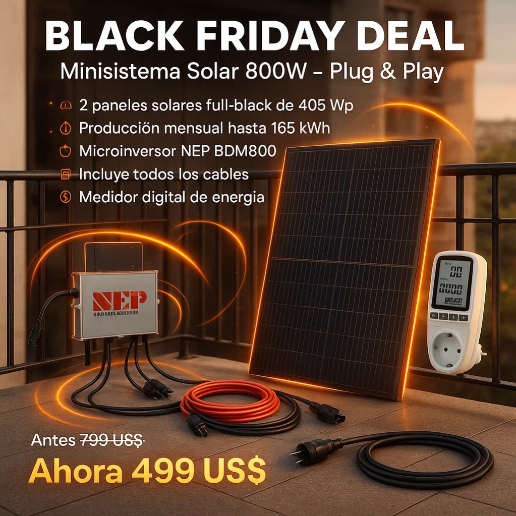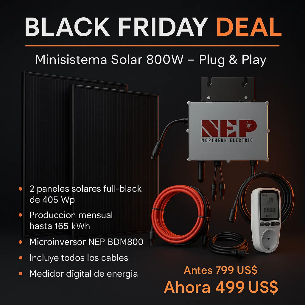 El NEP BDM800 es el inversor microondas perfecto para instalaciones de autoconsumo, como los sistemas en balcones o pequeñas plantas fotovoltaicas en tejados. Convierte la energía solar generada por los módulos fotovoltaicos en corriente alterna compatible con la red eléctrica, permitiendo su uso inmediato en el hogar y reduciendo así el consumo de energía de la red pública.
