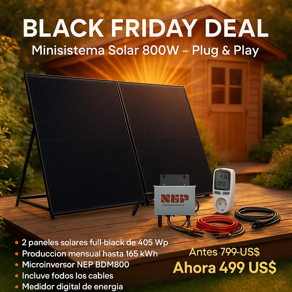 Una instalación solar con enchufe (también conocida como «Balkonkraftwerk» o sistema fotovoltaico mini) es un pequeño sistema solar fácil de instalar, que se conecta directamente a la toma de corriente doméstica.